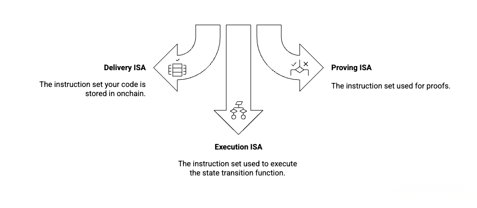 As a builder, you interact almost entirely with the delivery layer. This is where your contracts live, and this is where performance gains matter most. A key insight is that the delivery ISA does not need to match the proving ISA or the execution ISA. The ISA that works best for circuit layouts is rarely the ISA that works best for safe execution and predictable optimization.